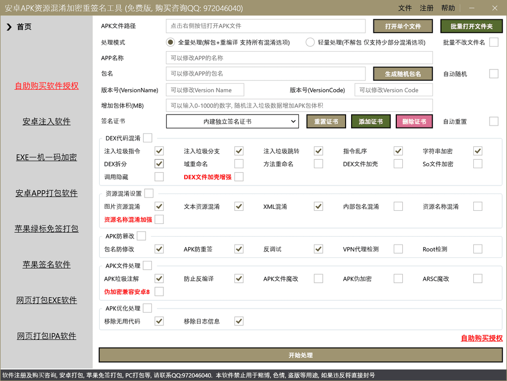 安卓APK资源混淆加密重签名工具,可以对安卓APK文件的代码和资源文件进行混淆加密处理,可以对安卓APK文件进行加固,对代码和资源文件进行混淾,重新签名等功能. 可以保护APK,增加破解难度等功能.