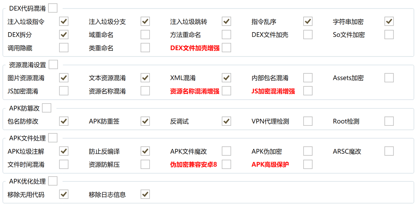 设置说明本页总览设置说明 配置截图 混淆配置详细说明 注入垃圾指令 勾选此项后,可以在DEX中注入一些无用垃圾指令 注入垃圾分支 勾选此项后,可以在DEX中注入一些垃圾分支语句 注入垃圾跳转 勾选此项后,可以在DEX中注入一些垃圾跳转指令 移除无用代码 勾选此项后,可以移除DEX中的一些注释调试等无用信息 指令乱序